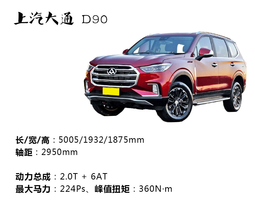点评:继哈弗H9、长安CS95后又一款自主中大型SUV,超5米的长度、轴距接近3米以及非承载式车身结构让D90有资格进入全尺寸SUV范畴。大通作为颇具英国传奇色彩的商用车品牌,选择以国人喜闻乐见的大SUV打开国内市场缺口,D90有望于今年8月上市。