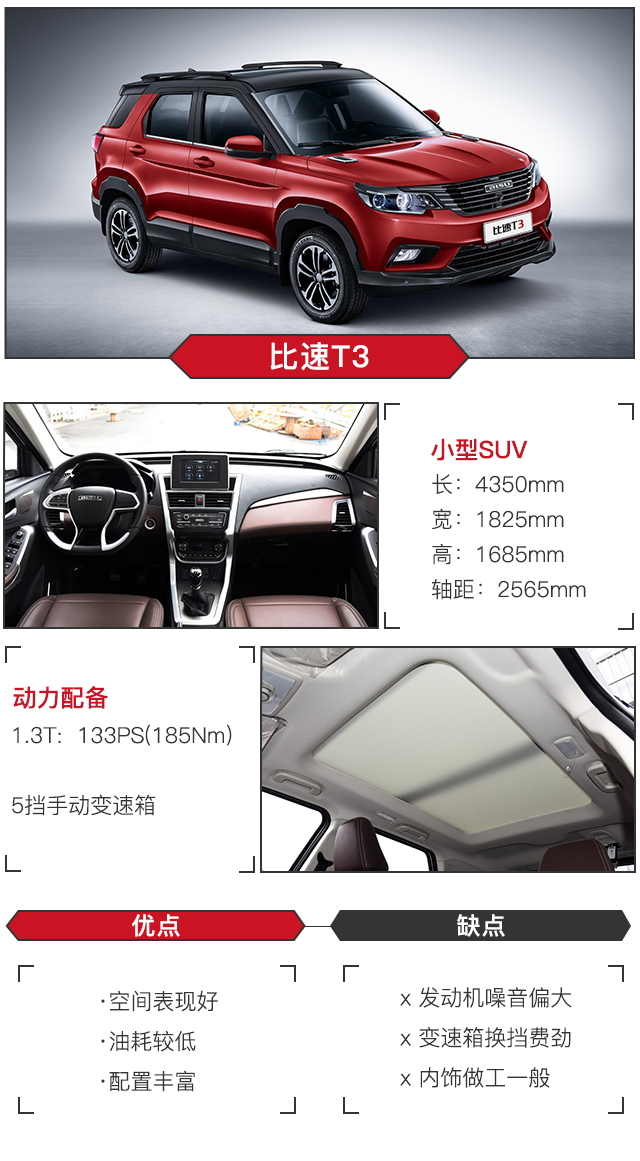 比速T3的乘坐空间宽敞,搭载1.3T发动机,采用5挡手动变速箱,动力起步有些弱,1700转涡轮介入后小有推背感,家用是完全足够的。