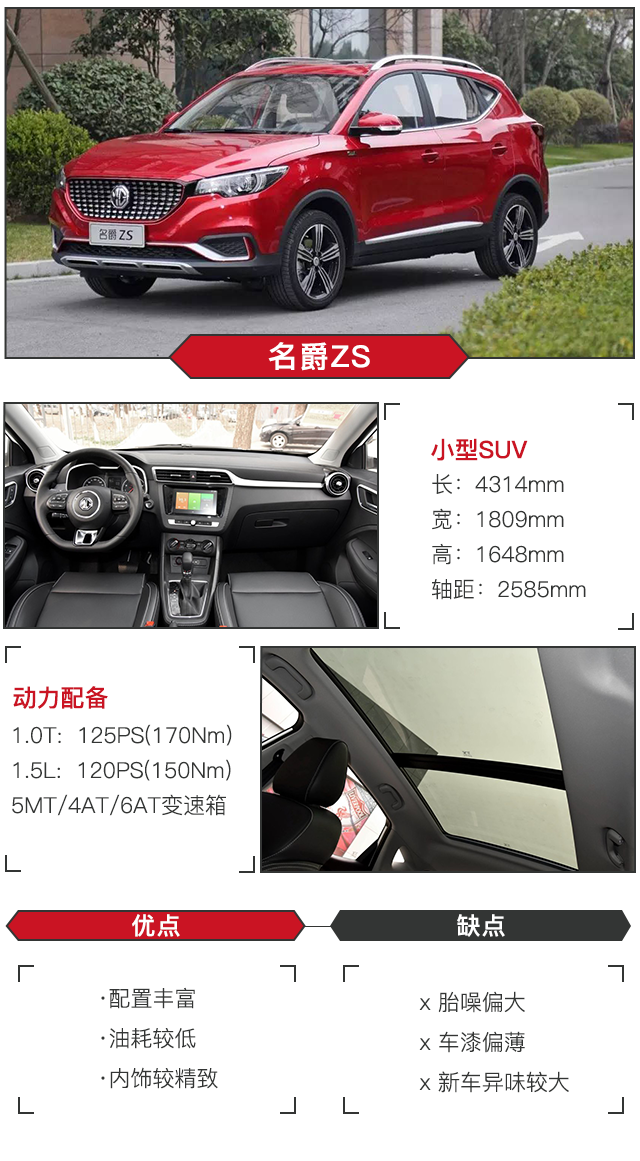 名爵ZS的外观还是比较潮流的,动感的车身线条,要是再加上面积较大的全景天窗,的确很有档次感啊。同时它的空间表现良好,油耗令人满意,内饰做工较为精致。