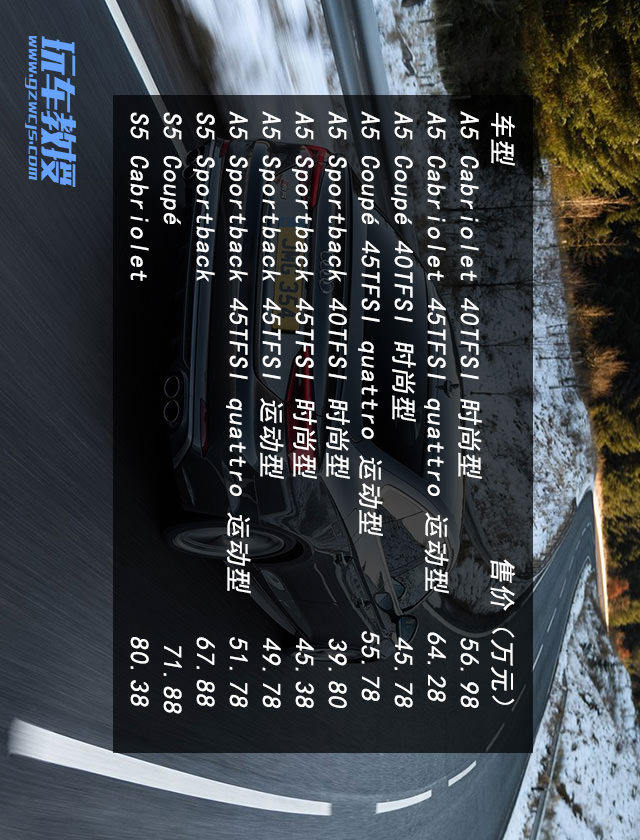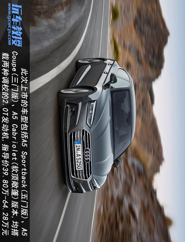 首代A5 Sportback在2009年奥迪建厂100周年纪念庆祝活动中发布,时隔8年后,奥迪正式推出新一代A5。全新A5融合了优雅的情感化设计,具有高功能性和优秀的室内舒适度,搭载了奥迪最新的信息娱乐系统。另外,还采用了重新设计的悬挂系统、更高效的驱动系统和创新的驾驶辅助系统。