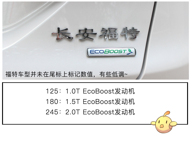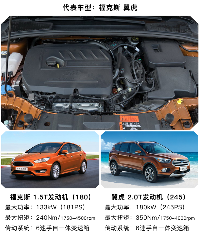 好了,接下来咱们得说说福特了,它就比较特殊,采用马力值来进行标识。1.0T的马力值正是125匹马力,装备的有福克斯、翼搏等车型,匹配6AT效果还是妥妥的;而180匹马力自然就是1.5T,福克斯、翼虎等都有搭载。245则对应2.0T发动机,则是蒙迪欧、金牛座等高端车型搭载的机型了。