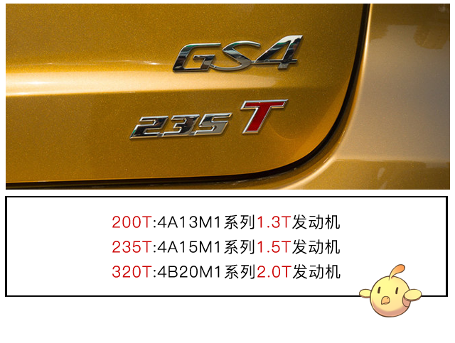 传祺的三款涡轮增压发动机标识对应的扭矩也基本符合,1.3T(200T)匹配的是7速双离合变速箱,搭载于传祺GS4身上虽然动力输出没啥问题,但平顺性却比较一般;而1.5T(235T)换装的6AT变速箱才是目前最值得选购的机型。
