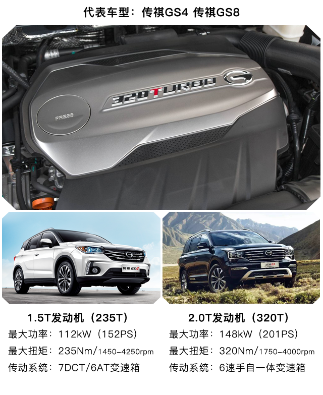 2.0T(320T)发动机搭载于最具代表性的传祺GS8身上,中型SUV市场绝对的一匹黑马,不过实际上这套动力只能算是中规中矩,而且后悬过减速带时弹跳感也比较明显,如果你是坐在第三排,中午吃饭时记得别吃太饱。