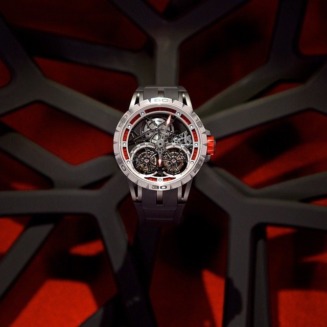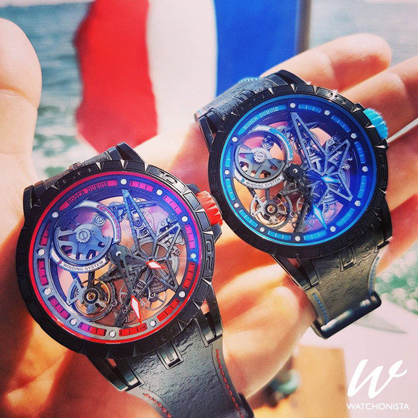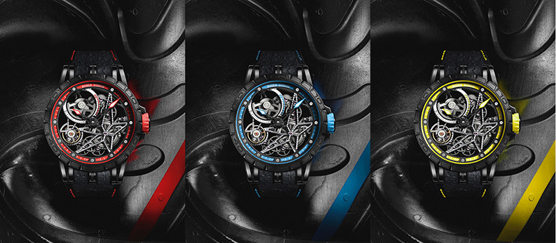 罗杰杜彼&倍耐力本次推荐的Excalibur Spider Pirelli腕表系列共有:主黑配红、黄、蓝三种配色。