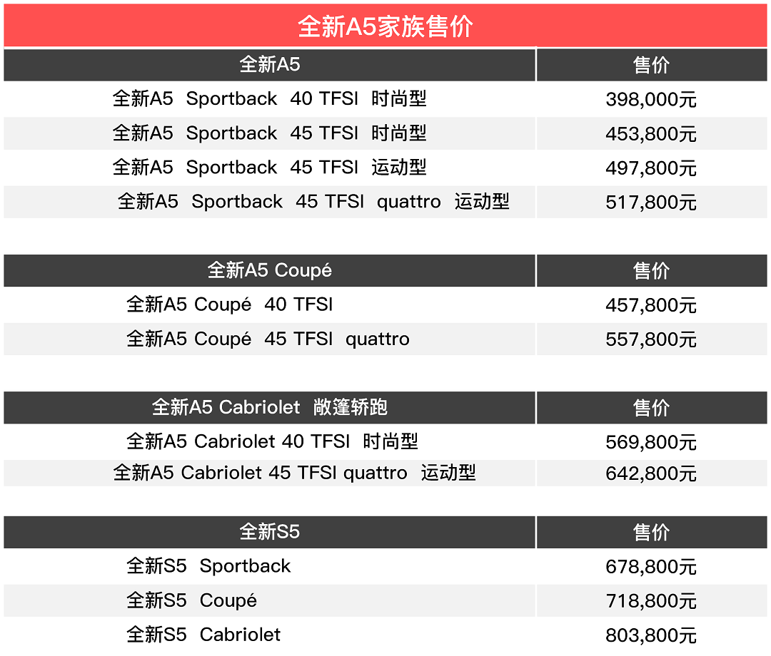 全新A5 Sportback售价在39.8万-51.78万,双门Coupe售价是457800元和557800元,Cabriolet敞篷轿跑是569800元和642800元,至于性能车S5的售价是678800元到803800元。全系车型售价在40万到80万的区间,对应宝马4系的42-83万。