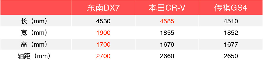 早已闻说东南DX7的一大特点就是“大”,便提前查了一下这款车的尺寸,发现DX7的宽度和高度都比同为紧凑型SUV的本田CR-V和传祺GS4要大。这也是为什么很多人看了DX7之后都会感叹,这辆车真的大。