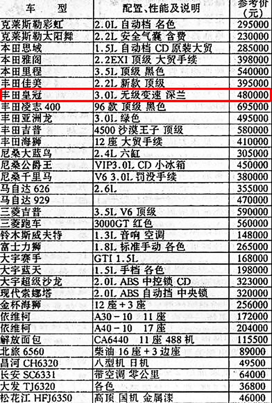 (图为一张90年代汽车价格表,但配置一栏的数据有误。皇冠从来没有使用过无级变速箱,正确参数应该是4AT变速箱。)