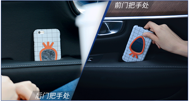 只是妹子坐于前排后,就发现了一个S90稍微“反常规”的设计细节,后门板的把手处做了封底处理,形成了一个储物空间,但前排相同的位置却是镂空处理,这也让妹子随手放她的水果手机的时候直接掉了在地上。