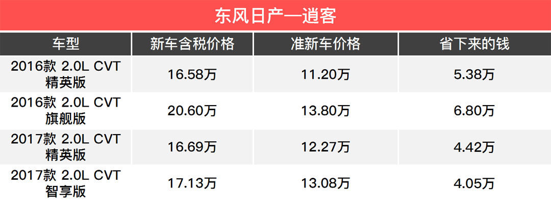 虽然在动力方面提供了1.2T和2.0L排量的发动机,不过在二手车市场上的车源多数为2.0L的排量。以2017款2.0L排量的车型进行对比,选择日产逍客二手车可以省2.5-4.5万左右;以2016款2.0L排量的车型进行对比,选择日产逍客二手车能省4-6万左右,在价钱相差不多的情况下,教授更推荐选择2017款车型。