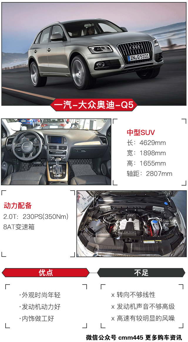 Q5这款车整体表现比较均衡,目前相较同级较大的优势就是优惠比较吸引。外形设计现在来看,还是不显过时,能做到老少通吃。2.0T+8AT的表现比之前的7挡双离合要来得更为自然,低速蠕行时不容易发生顿挫,不过在急加速时的降挡稍微慢了一点。