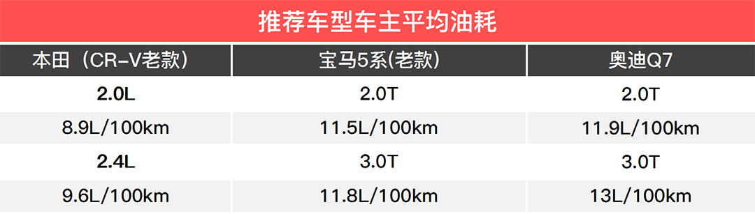 对于三款车型来说,你会发现一个减少汽车油耗的关键地方,首先就是从发动机入手,使用更先进的发动机无论是对油耗还是动力方面都会有着大幅度的提升;第二个就是大幅度降低车身的整备质量,无论是对操控还是对动力方面都会有着极大的提升;最后一个就是采用新能源技术,譬如本田CR-V的i-MMD混动系统和Q7的e-tron,都是对油耗有着极大的帮助。