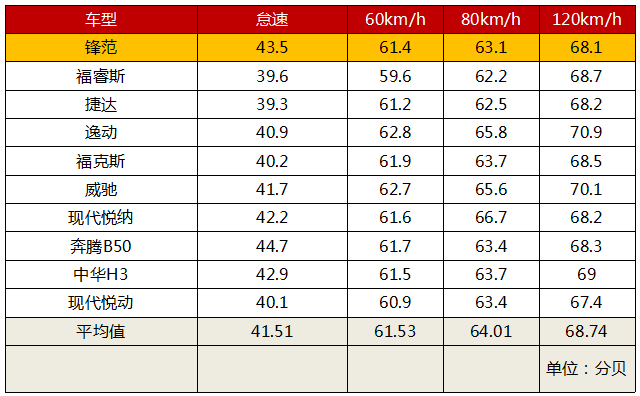 首先看看10万级的本田车型锋范,实际上这个价位的车隔音水平表现都一般般,从数据看锋范的噪音其实只是这个价位的正常水准,除了怠速噪音高于平均值之外,其它指标都比平均值低,所以说这个价位车型不是锋范隔音差,而是所有车型隔音都差。