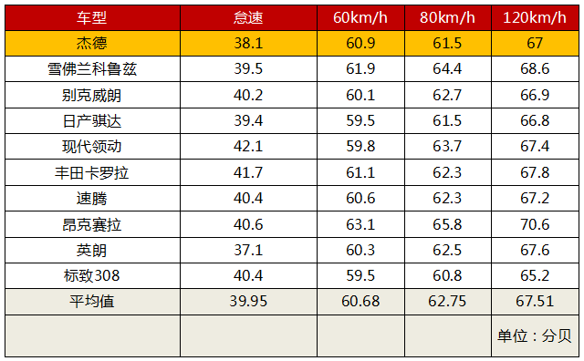 之前说到低价位本田车型的隔音比较差,但是作为中国特供车的杰德并不同,本来两厢车的结构、大尺寸的车身是不利于噪音控制的,但是杰德硬是做出了一个同级别中相对优秀的隔音,与同价位车型相比杰德的各项测试数值均低于平均值,这也看出特供本田在隔音上表现确实不错。