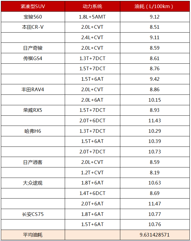 这些车型的油耗表现算是很恐怖了,有大风阻和重车身的紧凑型SUV仅仅只有紧凑型轿车的油耗,这样的车型买下来能够为你省下不少油钱。