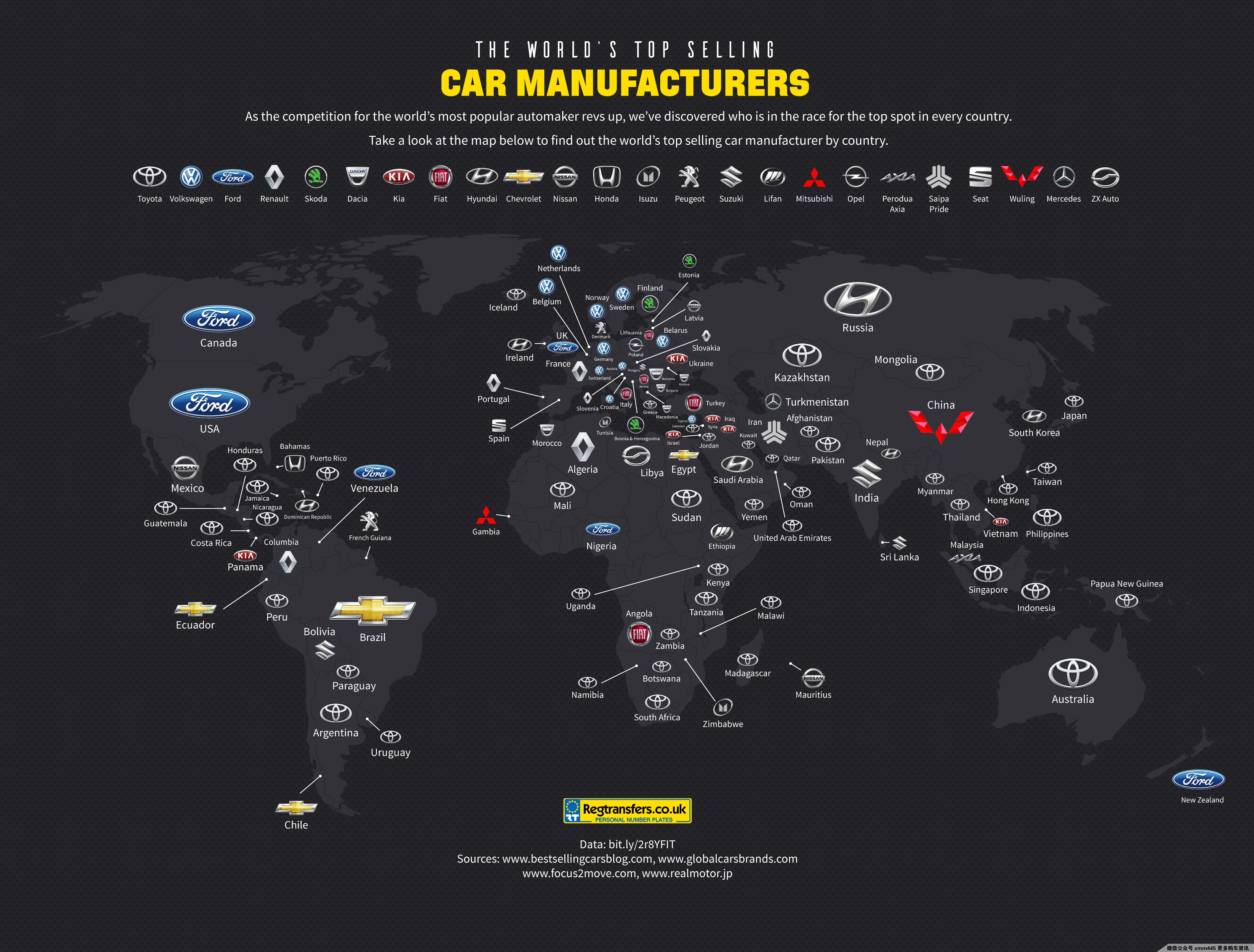 最近英国最大的汽车牌照经销商Regtransfers就公布了一张的汽车销量地图,展示了2016年世界主要国家/地区的销量榜首,我们不妨看一下这其中究竟有什么有趣的事情。