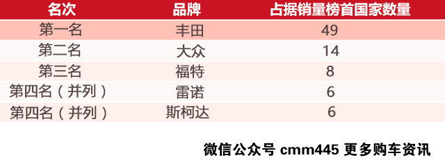 在这张地图中,一姐整理了世界前五最受欢迎汽车制造商,它们分别是丰田、大众、福特、雷诺、斯柯达(并列)。丰田用自家车型征服了全球49个国家,这让人不免想丰田究竟开了什么外挂,能让这些国家人们倒戈选择外来品牌?