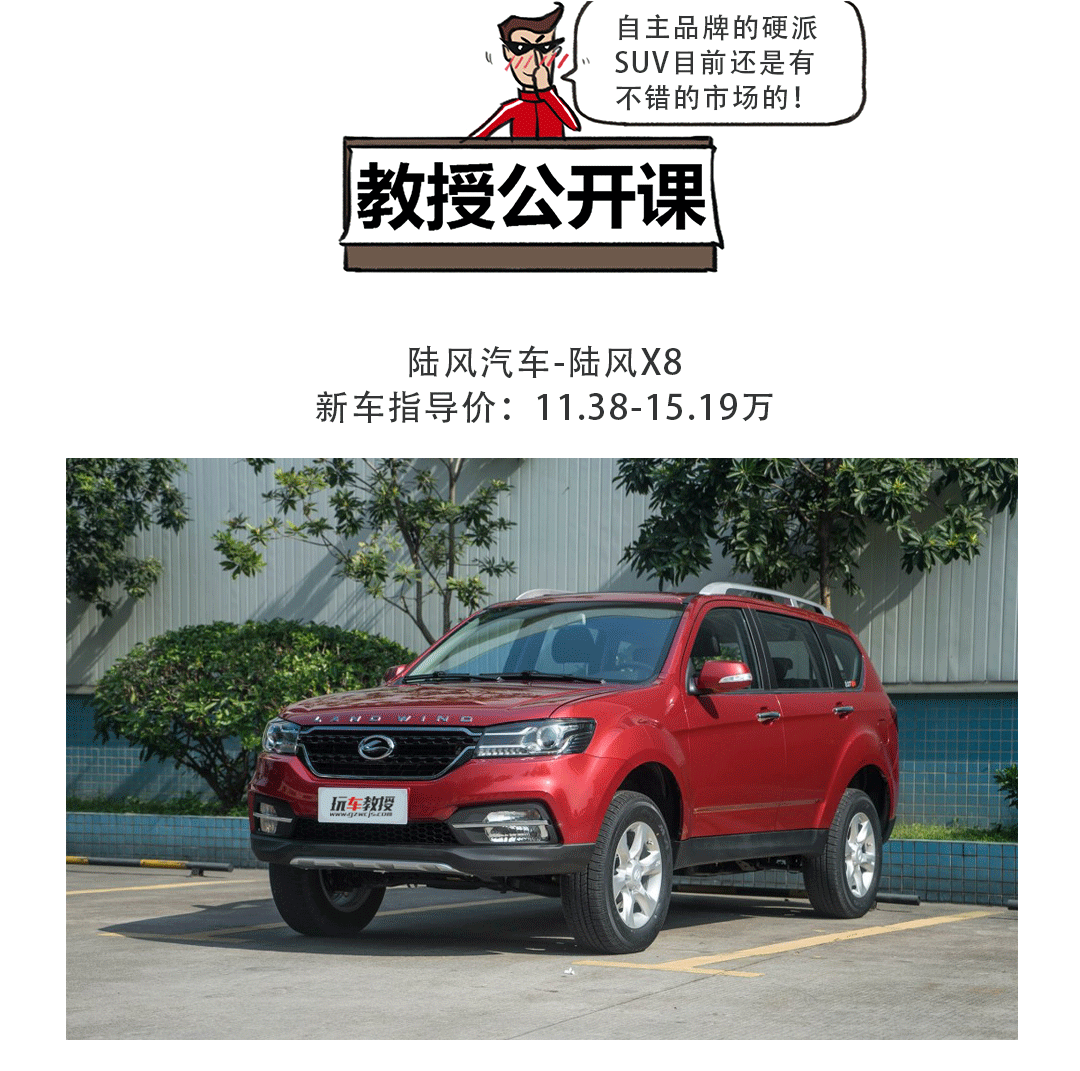 如果让教授在陆风汽车里面挑一款SUV的话,那么教授肯定是选择这一款陆风X8。单看外观就不难猜出这是一台拥有越野风格的SUV,最低离地间隙非常高,通过性强。关键外观也足够霸气,这一点非常重要。电子式驱动转换器、机械锁止式差速器以及充气双向液压筒式减震器,这些都为陆风X8提供强悍的越野性能,同时还继承了旧款车型专业的越野底盘,想撒野就撒野。十五万内能买到越野性能不错的SUV,陆风X8绝对不算热销车型,但为我们消费者提供不错的选择。
