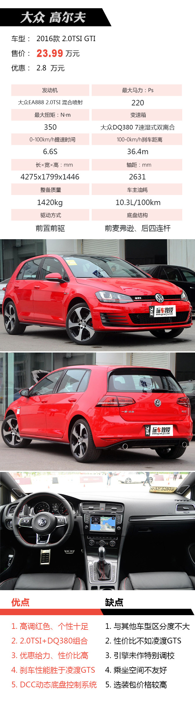 扯蛋:高尔夫GTI与普通版的区别在于:前者选用四连杆后独悬和美国MONROE蒙诺减振器,而非后扭力梁非独悬。独有的DCC动态适应底盘控制系统,可主动调节减震的软硬程度,还可同步改变方向盘转向力度和车身反应灵敏度。亲民、纯粹的小钢炮。