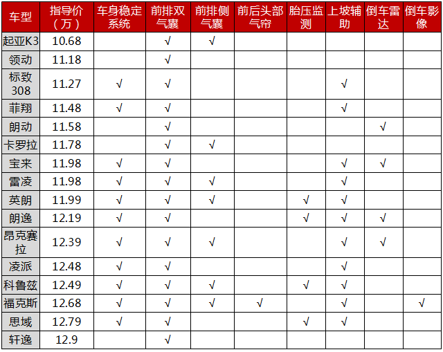 通过对比表格我们可以发现这些标准紧凑型轿车自动挡入门车型的价格都在10-13万之间,结合优惠来看其实实际价格差距不大,但是安全配置差距还是挺大的,咱们逐一分析: