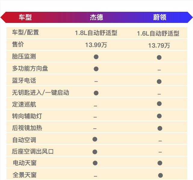 在配置设定方面,杰德与蔚领的走的路线相差不远,二者都为了营造更舒适、便捷的使用环境,只是体现的点不一样而已。本次我们选择1.8L自动舒适型的杰德进行对比,售价为13.99万;蔚领方面,迎战的是售价为13.79万的1.6L自动舒适型。两款车型的售价接近,同时也是车系中较为走量的车型,具有较大的比较意义。杰德配备了无匙进入/启动、多功能方向盘、自动空调、后座出风等,更注重让用户在日产使用过程中体验到便利性。