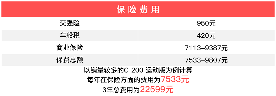 以销量较多的C 200 运动版为例,商业险选择50万赔付额度的三者险、车损险和不计免赔,一年需要交纳保险费与税费一共7533元。
