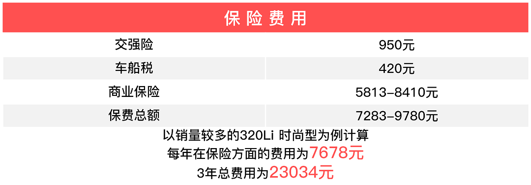 三款车保养费用整体来说差距不大,都是二万出头,作为拥有一辆豪华车的代价如何,还请各位各自掂量掂量,本文统计的保险费用只包含三者险、车损险和不计免赔,都是比较基本的险种,教授建议根据实际情况提高三者险的额度,以及可以增购其他险种。