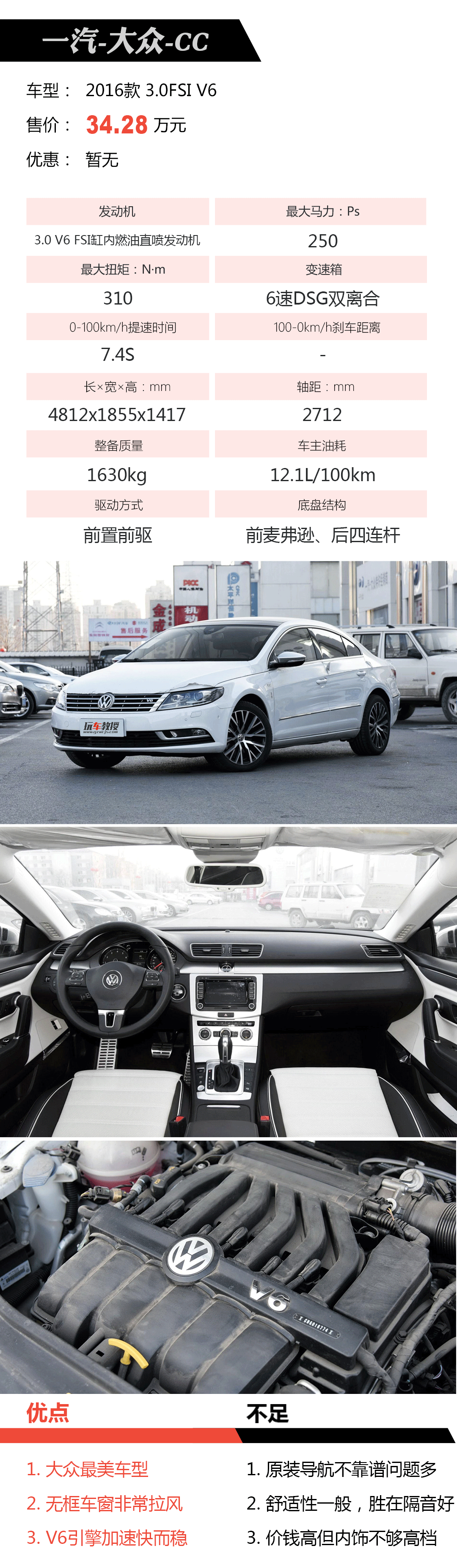 3.0FSI V6是CC的顶配车型,全系标配无框车窗并不是顶配的独有的,最大的区别当然就在于“V6”的心脏,250匹马力绝对能满足那些追求强劲动力的消费者,也是该车型的地位象征。