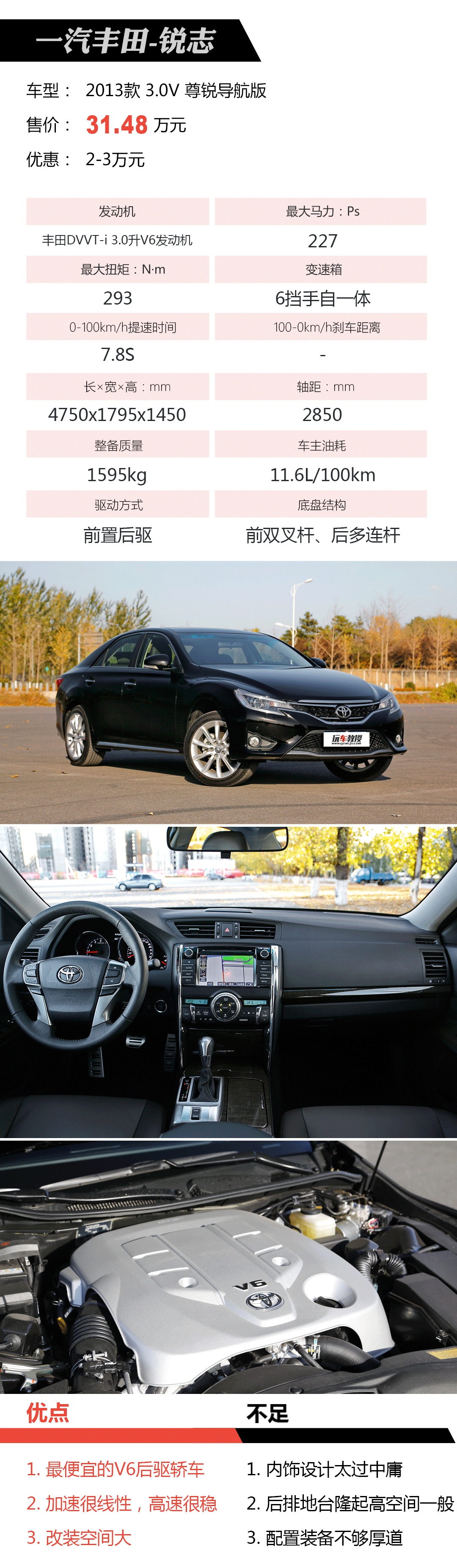 无论是2.5L还是3.0L发动机,都是“V6”大心脏,3.0L的车型同样是为了提高车型的定位和高度,购买顶配车型的消费者很少,毕竟很多人都是冲着“最便宜的V6后驱车”而买锐志,2.5L的低配车型才是最佳的选择。除了V6发动机之外,锐志后轮驱动形式也是一大卖点,相比前驱车驾驶起来更有操控感和激情。