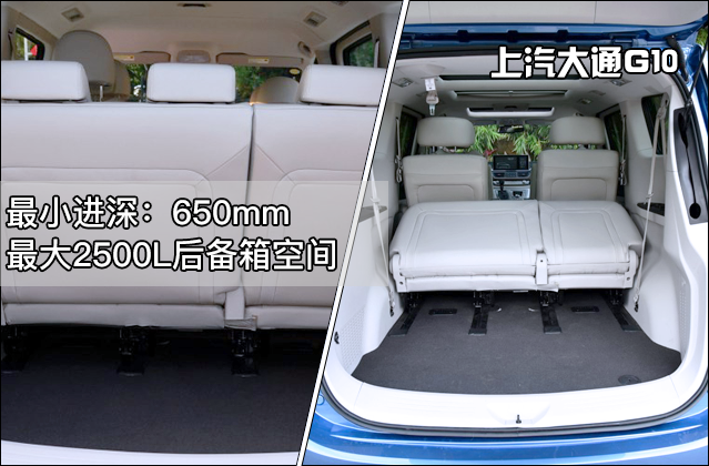 旅行车的最大特点之一就是后备厢特别能装。而MPV由于座位灵活性高,将第三排放倒后也有充足的行李空间。大通G10在座椅常规下,行李空间属于一个正常水平。但如果将后排移到最前且放倒的情况下,后备箱空间最大可达2500L。