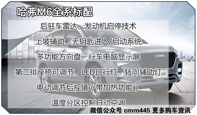 哈弗M6的推出就是如此,顶配不过十一万不到,自动大灯、LED日行灯、感应雨刷这等逼格尽显的配置一应俱全,更别提全系标配的自动空调、ESP、无匙进入/启动系统、8英寸带导航功能的多媒体中控屏幕等非常受中国消费者青睐的配置了。