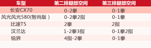 外观硬朗大气,从尺寸参数来看,比速T5是三款车型中长度、高度占有优势的,但是第二排不能前后移动,只支持靠背角度调节,缺乏空间灵活性。第二排腿部有2拳的空间表现,但是第三排只剩余2指空间,也够用了。