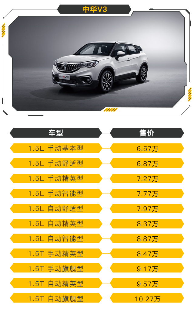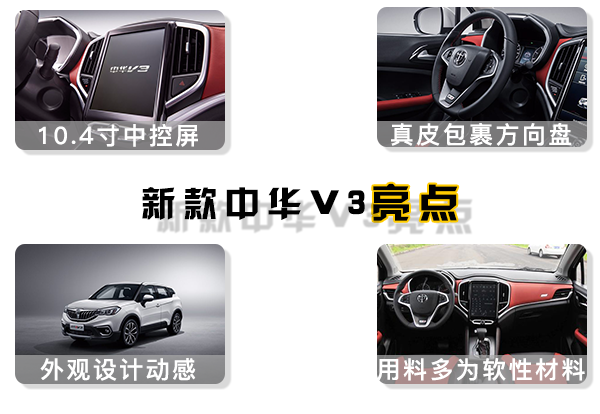 新款中华V3,作为一台中期改款的小型SUV。车头和车尾有比较大的变化,它采用了最新的家族式前格栅设计,看上去更年轻了~而最能吸引到一姐的还是10.4寸中控触摸大屏,大的东西有谁不爱呢?嘻嘻~