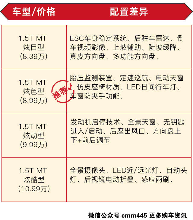 而自动挡也有4个配置可选,国人所喜爱的配置也都配齐了,至于怎么选,看是要看你口袋里的钱有多少,比较薄弱点的呢,可以选择1.5T AT 炫彩型,定速巡航、无钥匙进入/启动。发动机启停技术等一应俱全;值得一提的是顶配车型,售价为13.29万,各项高科技配置都有,可以说是非常丰富,具有较高的性价比,如资金充裕消费者,选顶配完全没问题。