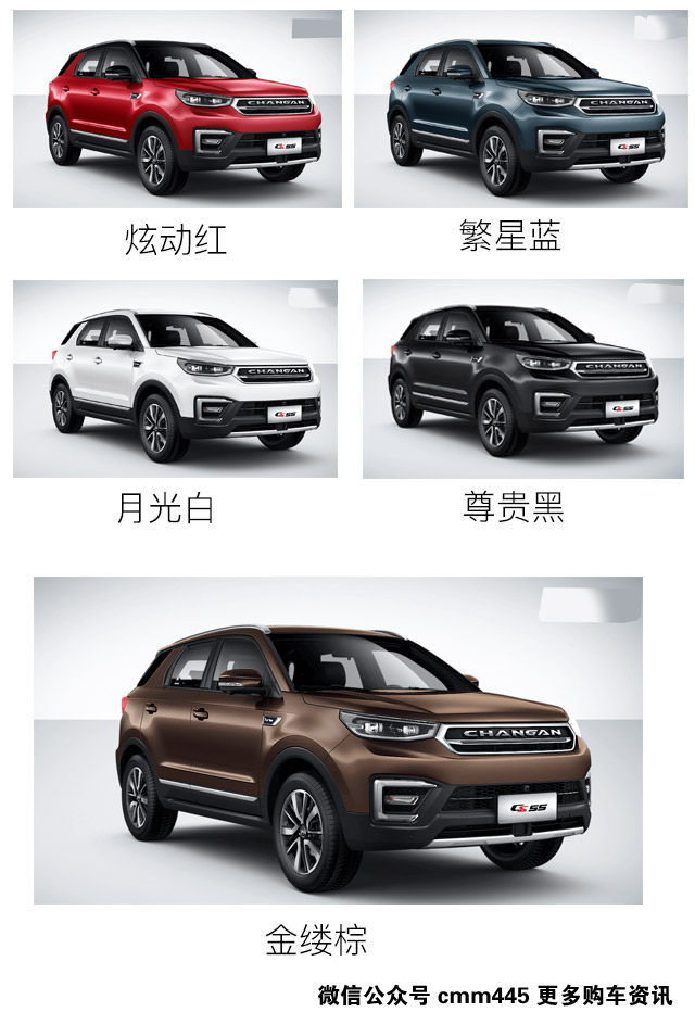 长安CS55共提供5种颜色选择,当然在车身颜色方面只能说见仁见智了,每个人审美观不用,成熟稳重消费者可选金缕棕或者尊贵黑,而追求个性时尚的年轻消费者,肯定首选炫动红,不要问我为什么?够骚气!