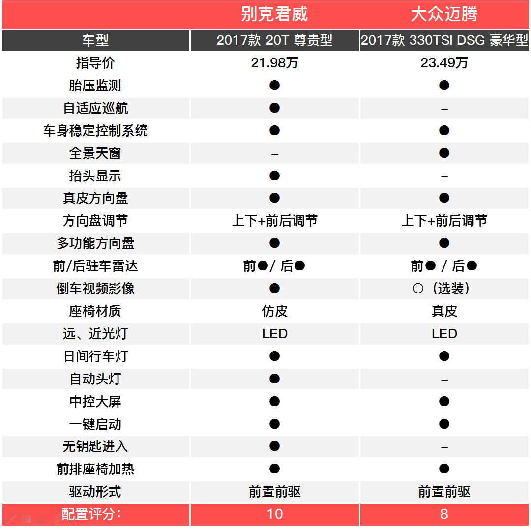 全新迈腾作为一款主打商务与日常家用的中型车,主推的是1.8T车型,其1.4T车型更多是用来拉低售价的。至于全新君威则不同,换代之后整体变得更加年轻,虽然轴距没有加长的迈腾那么大,但后排空间确实宽敞了不少,实用性完全不成问题。而且新君威的1.5T的车型不仅价格亲民,其配置比迈腾主推的1.8T车型更丰富。今天教授就用君威最值得推荐的20T尊贵型与迈腾 330TSI DSG 豪华型对比一番,看哪款更值得购买。