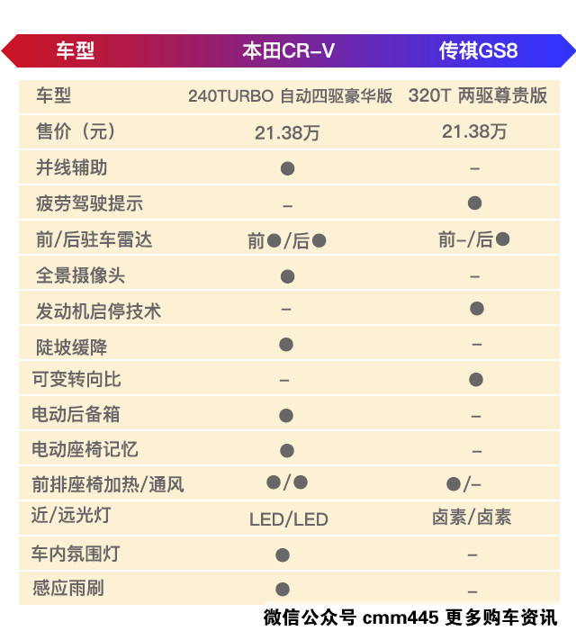 为了得到公平,所以我们就挑选同价位车型对比。从图表上能看出,很明显传祺GS8在配置上更占优势,舒适性配置一应俱全。再来看CR-V的配置,明显要低不少。所以配置表现上GS8胜。
