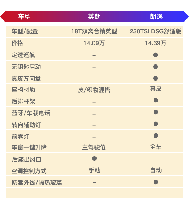 从上面的配置差异可以看出,朗逸2017款230TSI DSG舒适版虽然要贵6千元,但是实用的配置要更齐全一些,我对朗逸的好感瞬间有所提升。