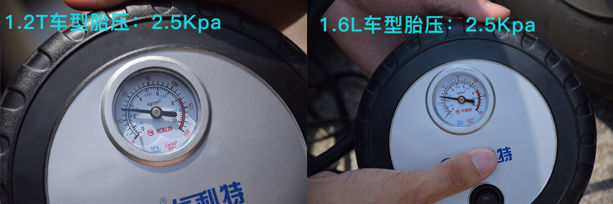测试之前我们要先将两辆车的胎压调至2.5Kpa,保持共性、减小差异。