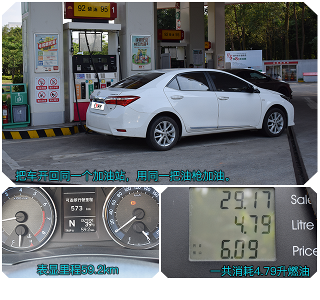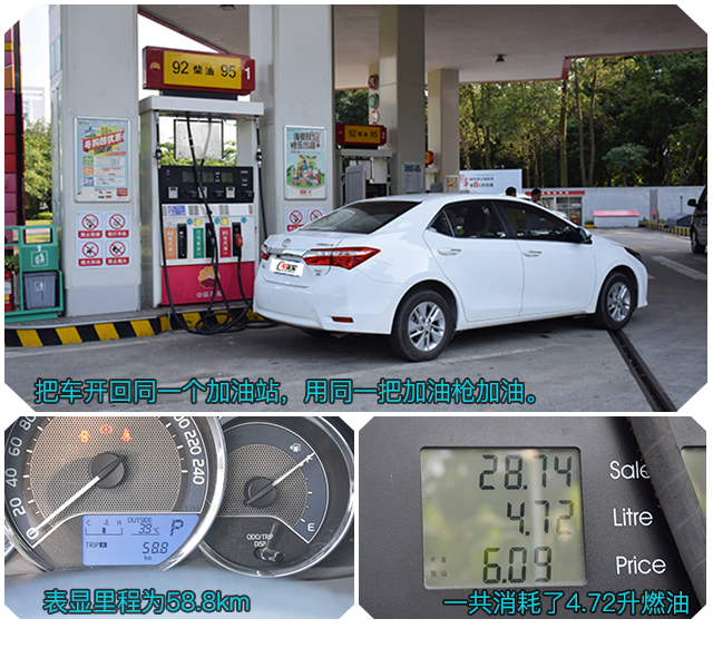 四圈跑完之后,我们把车开回同一个油站,使用同一把油枪用慢挡加满油,然后记录油表数据及车辆的里程数。