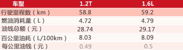 分析:可以看出,在接近60公里的行程中,1.2T车型与1.6L车型的燃油消耗量相差甚小。其实,无论是1.2T还是1.6L版本的卡罗拉,油门调教都以经济省油为取向,日常驾驶的巡航转速相差不远,因此1.2T车型的节油优势不太明显。此外,长达20km的模拟拥堵路段对1.2T车型来说也是个不小的考验,频繁的给油动作也极大地降低了其燃油经济性。再者,由于测试当天气温高达39度,两车的空调也是超负荷运转,油耗自然不会低。