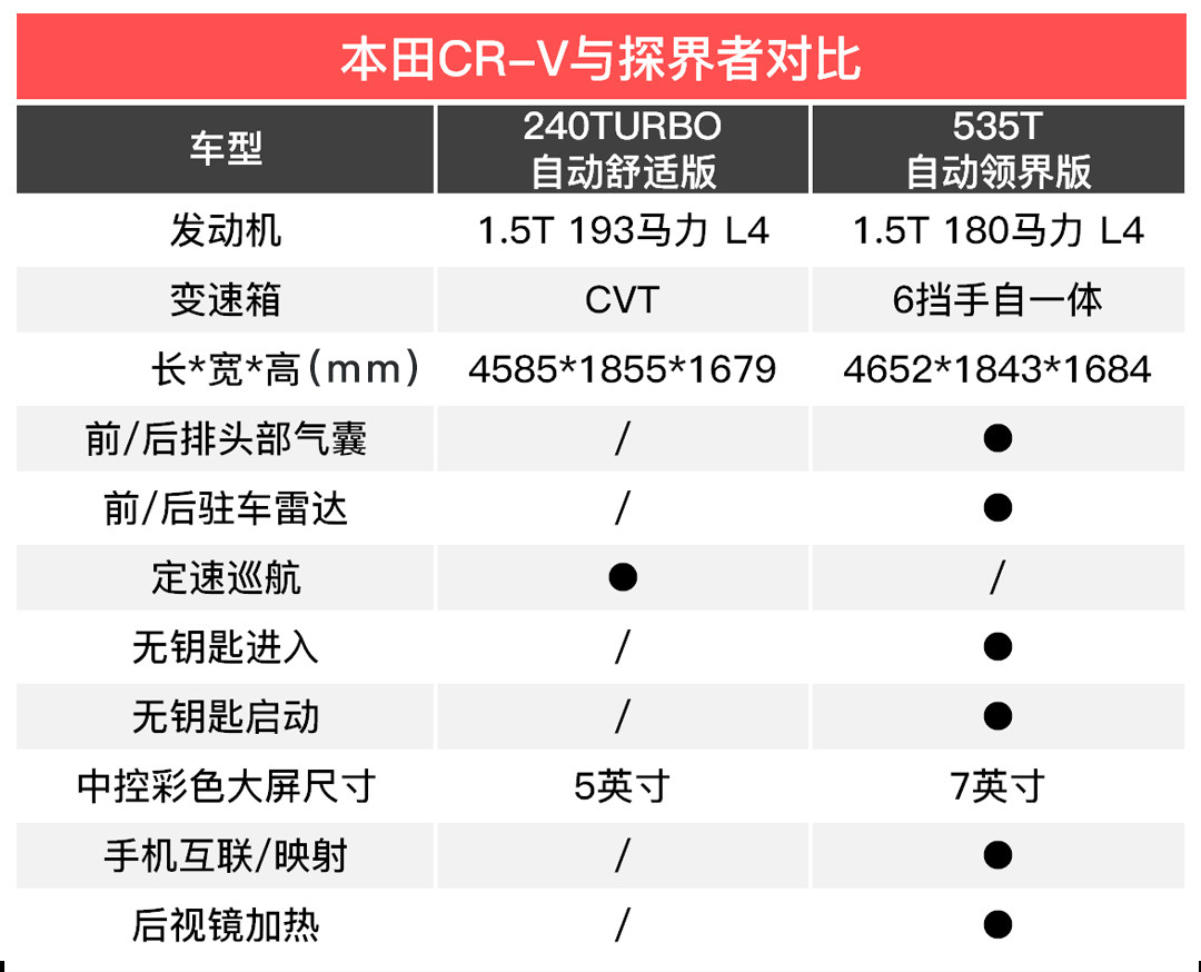 不过CR-V也不示弱,比如1.5T发动机在动力以及输出效率上就更胜一筹。而且本田CR-V的市场竞争力在于多年来的口碑积累,保有量以及保值率上相比探界者、柯迪亚克这些初来者也要更高。