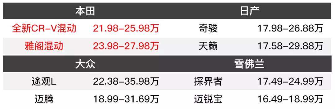这世道混合动力车分两类,一类是混社会的(为补贴而生),一类是混动力的(为省油而生),而新CR-V明显属于后者。与雅阁采用了相同系统,但价格却要低上两万元。并且低配混动车型还比雅阁多了全景天窗、主动降噪、蓝牙电话等一系列舒适性配置。再看看迈腾和途观L、奇骏和天籁,哪一款不是SUV比轿车贵?全新混动CR-V的这定价方面的确下了不少血本。