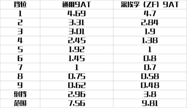 相对来说,采用了可选择式单向离合器的通用9AT,既减少了体积,也让换挡的平顺性更好,第九挡0.62的齿比也能让车子在95km/h左右就能挂上9挡,实现最大的经济效益,所以通用9AT最大的优势,就是十分接地气。