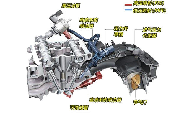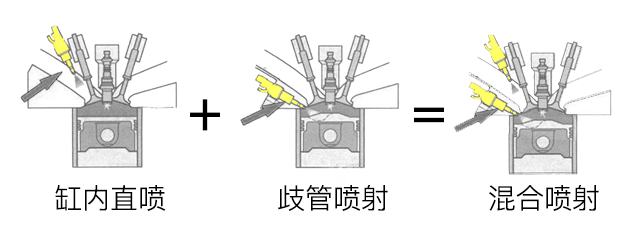 三弟(混合喷射)在低负荷工况时,发挥大哥的优势(歧管喷油嘴在气缸进气行程时喷油,混合气进入气缸),再加个二哥传给他的功力(压缩行程时气缸内喷油嘴喷油,从而实现分层燃烧)。而在高负荷工况下,混合喷射系统将只在压缩行程进行缸内直喷。