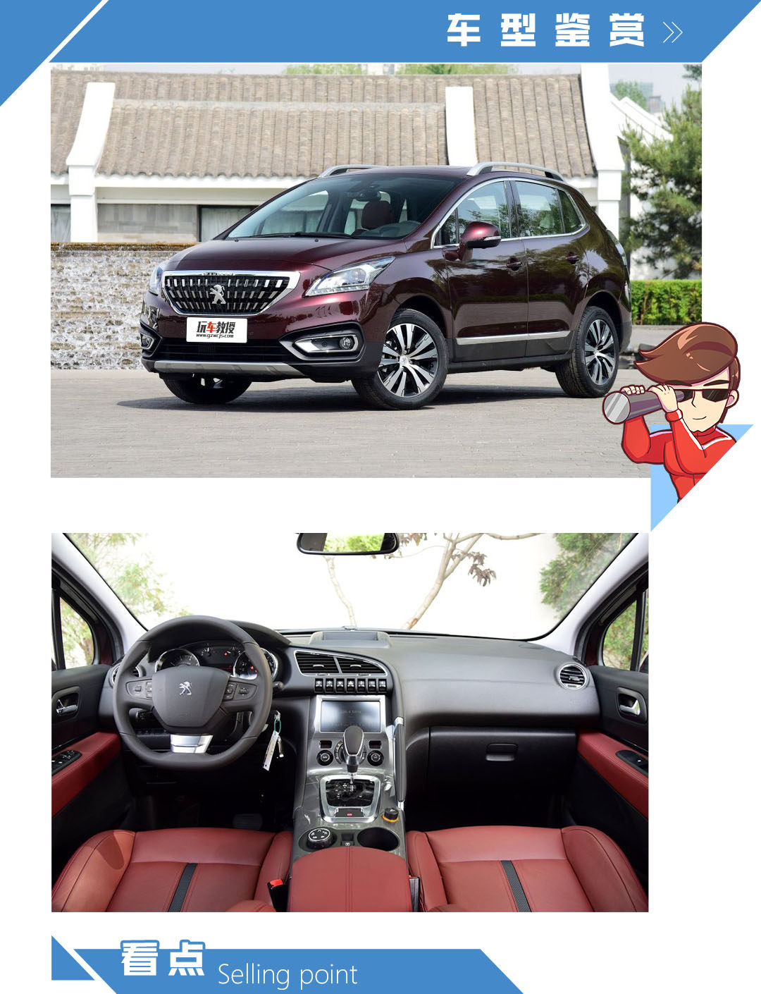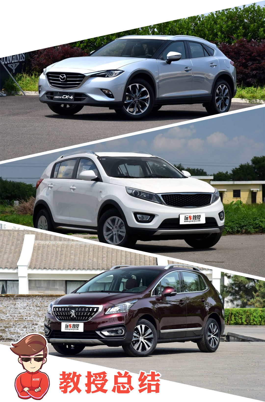 总结:今天教授所介绍的这三款车型都各有特色,标致3008虽然不是家族最新设计的SUV车型,但它依然拥有一个很有辨识度的外观设计,内饰也尽量做到优雅!马自达CX-4则完全是一个颜值怪兽,而且它出色的驾驶体验也是年轻人所重视的!最后的智跑虽然是一款上市多年的车型,但它的外观造型仍然非常出色,巨大的市场优惠则非常适合预算有限的消费者!