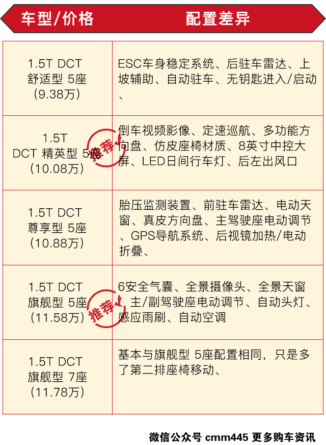 接下来就是到重要的环节了,配置推荐。此次新增车型主要是双离合变速箱车型,所以这里就着重讲下双离合变速箱的车型选择。如追求性价比可选1.5T 精英型 5座,售价为10.08万,消费者所注重的配置它都有,例如LED日间行车灯、仿皮座椅材质、后坐出风口等配置。如资金充裕可选旗舰型5座或7座,安全性配置也相当到位,且7座和5座之差了2000元,就是张座椅,至于要怎么选,还是要看你自己!