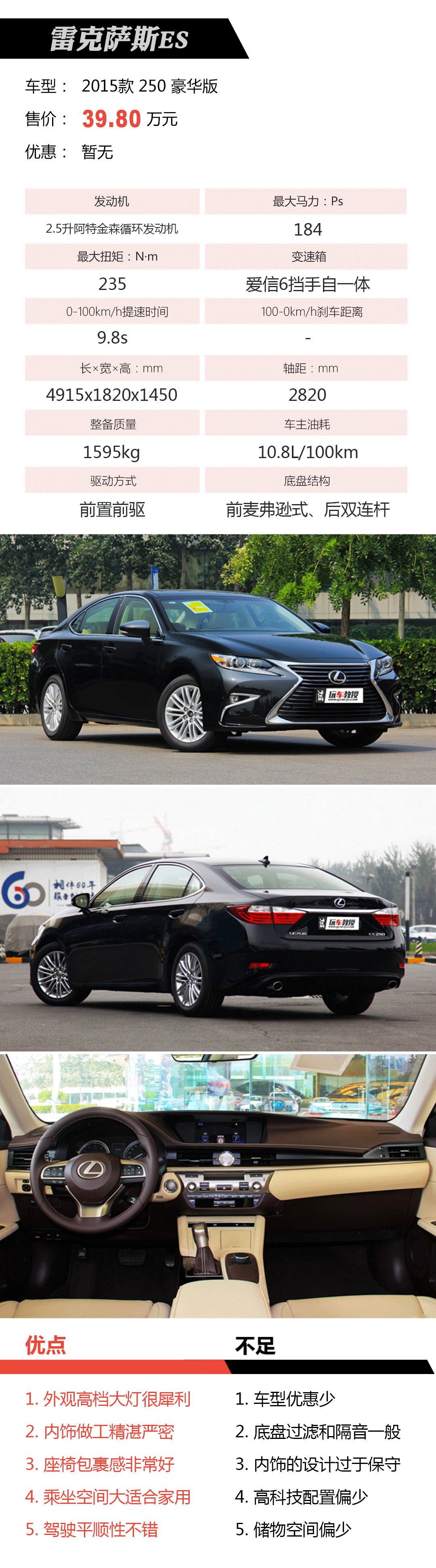 雷克萨斯ES是一款中大型轿车,接近五米的车身长度有着不错的车内乘坐空间,不过要注意的是ES是前置前驱车型,但后排中央地台的凸出比较明显,后排还是适合坐两个人比较舒适。现在大排量的自吸发动机车型已不多,BBA基本都主打涡轮车型,雷克萨斯算是“异类”了,2.0L的发动机在动力方面确实在某些方面比不上别家的1.5T发动机,不过2.5L的发动机动力还是能满足大部分用户的需求,追求的是平顺舒适性。还有一个好消息,就是新款雷克萨斯ES将基于丰田TNGA构架打造(和凯美瑞同一平台),有望在2018年正式发布。