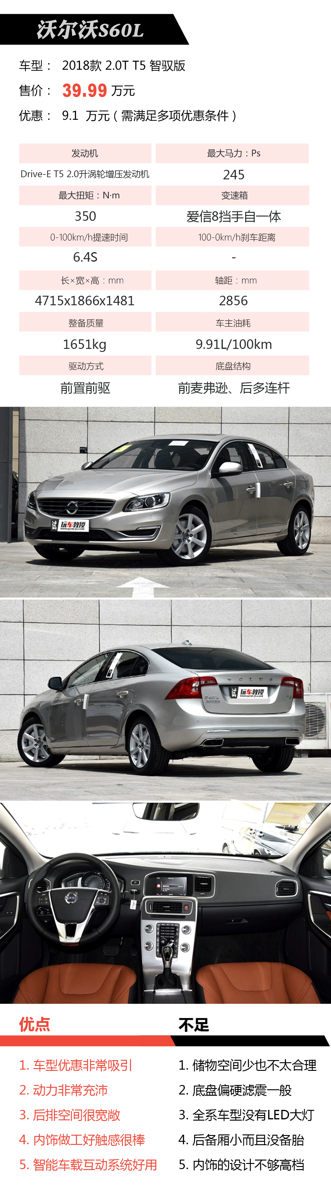 沃尔沃品牌素来有“安全”极好的口碑,现在上得档次的品牌在安全方面已经做得非常好,特别是品牌旗下的旗舰型轿车更甚,所以近些年来沃尔沃在安全方面的优势已不是那么明显。沃尔沃S60L身上的发光点不少,T5(2.0T高功率)版本的动力足有245马力,6.4秒破百,喜欢动力不能错过,最重要的一点就是目前S60L的现金优惠非常诱人,到店咨询或许会有惊喜。比如像30.99万那款2.0T T4 智远版,在广州优惠下来只要23、24万。不想跑4S店的话,你还可以先到教授的小程序里免费咨询价格哦。