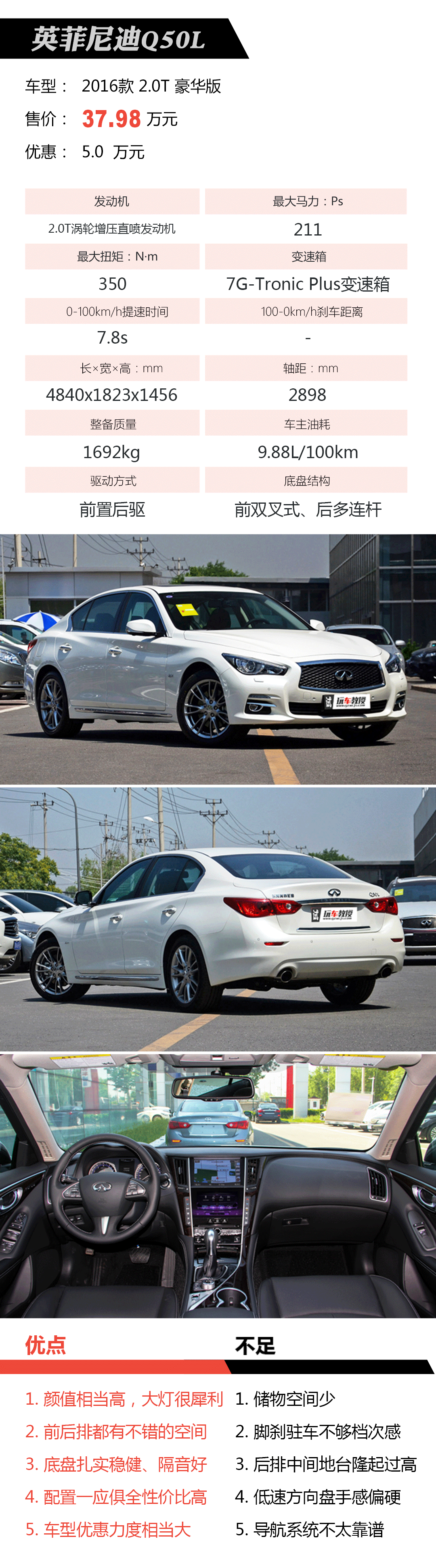 本身Q50L的起售价并不高,拿着30万的预算可以选择低配几款车型,全系标配2.0T动力、日产“大沙发”座椅相当舒适、乘坐空间也足够大,乃是均衡之选。如果你打算入手这款车,教授会建议你看看海浪蓝颜色的车型,非常漂亮,就如宝马M的专属蓝一样,十分迷人。
