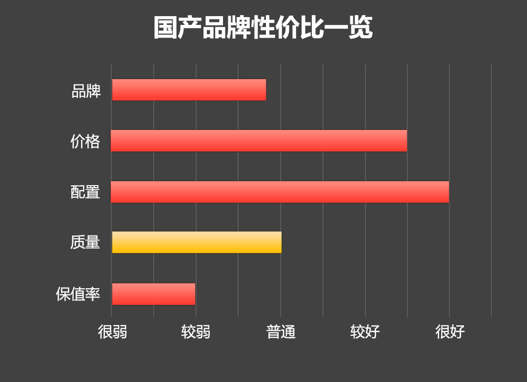 价低配置高,这是国产品牌车型的优势所在!但说句老实话,仅此而已!虽然我国国产品牌正在飞速发展,但依然处于起步阶段,而我们亲历国产品牌的进步也是在近几年,从山寨借鉴走到原创家族式脸谱、从外购动力总成到有了自主研发的发动机、变速箱等等,我国国产品牌确实在进步,但是它还是需要时间。